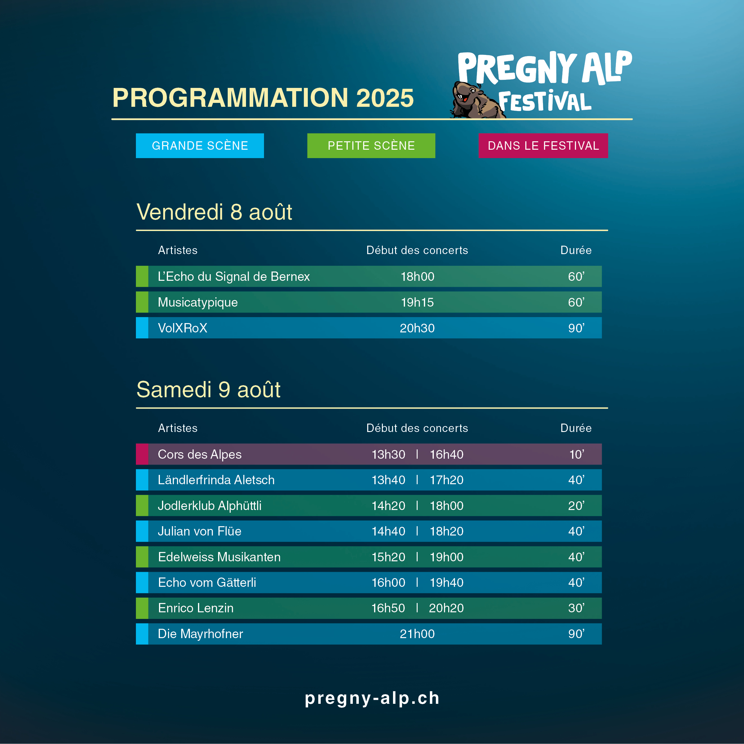 Pour cette 18e édition, vous pourrez découvrir onze groupes qui se produiront sur deux scènes. Cor des Alpes, schwyzerörgeli (accordéon schwyzois ou schwyzoise dans le langage populaire), yodel et hackbrett (une sorte de cithare sur table alpine) sont notamment au programme de l’édition 2025.